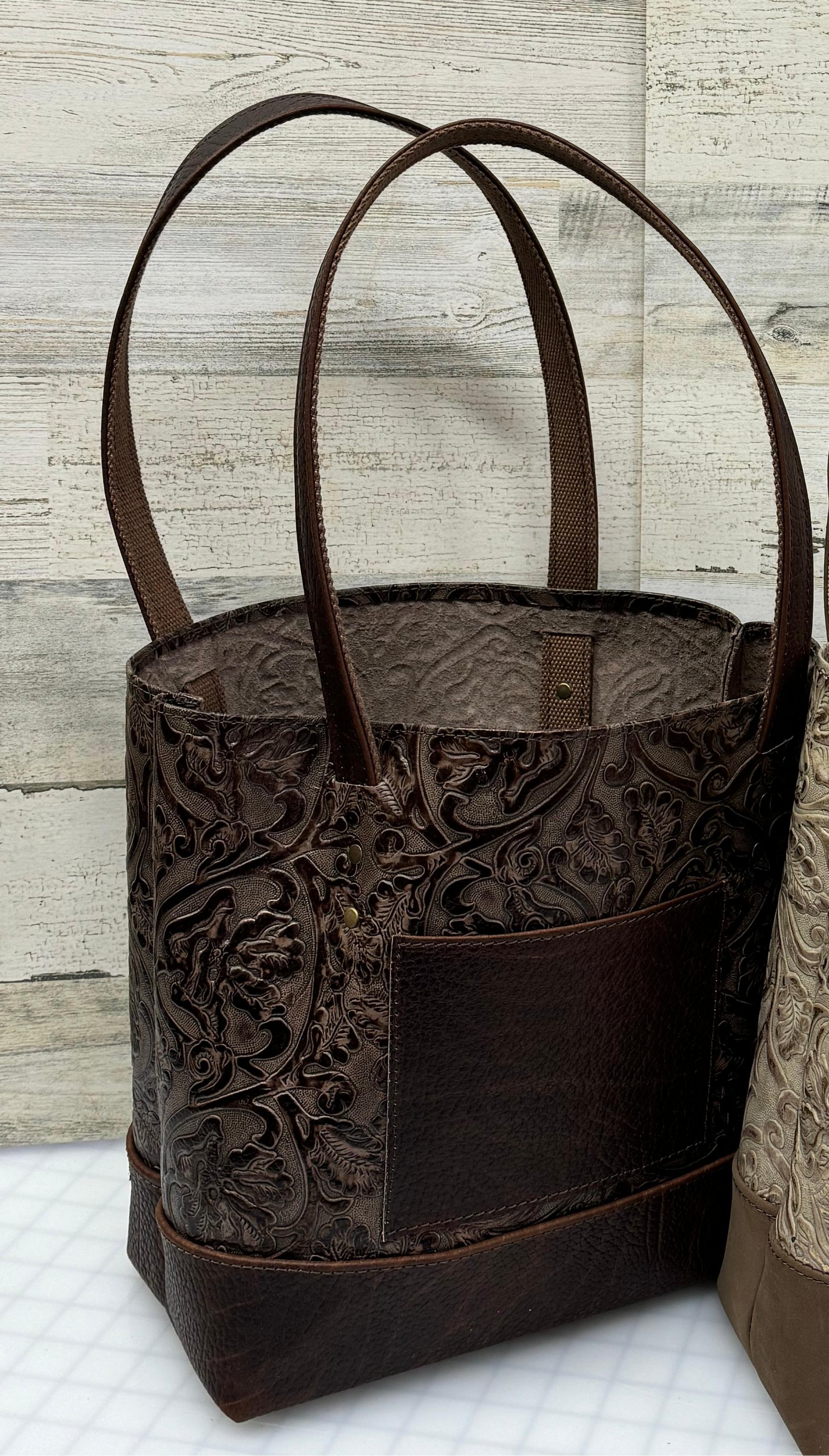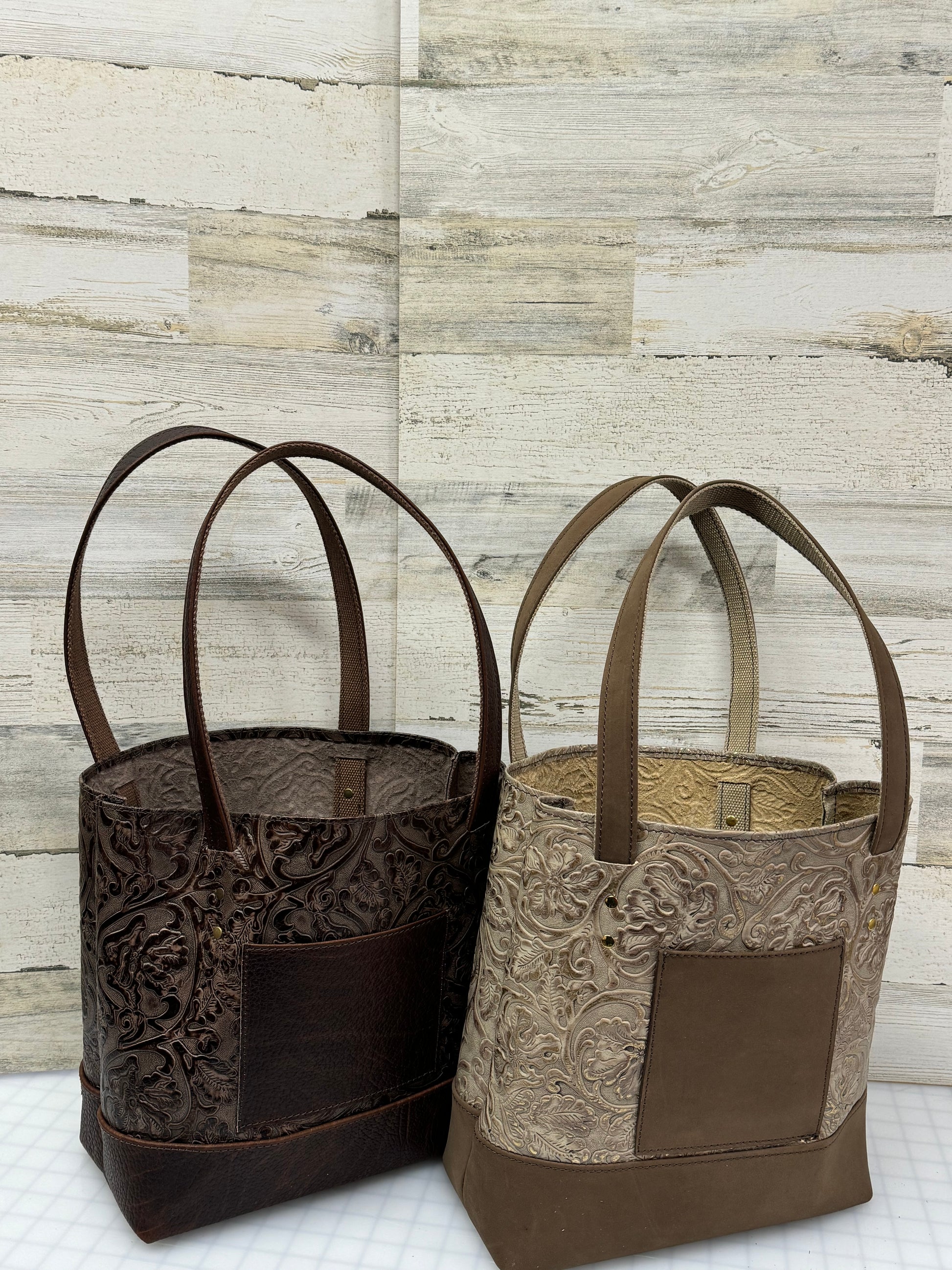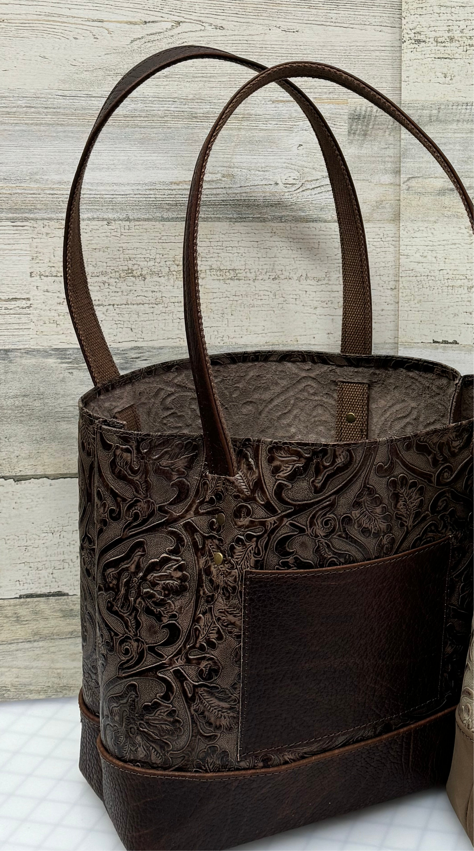 Basic Tote bag unlined so anything goes! Bottom and handles are both made with Bison. The body of the bag is a pretty embossed leather.